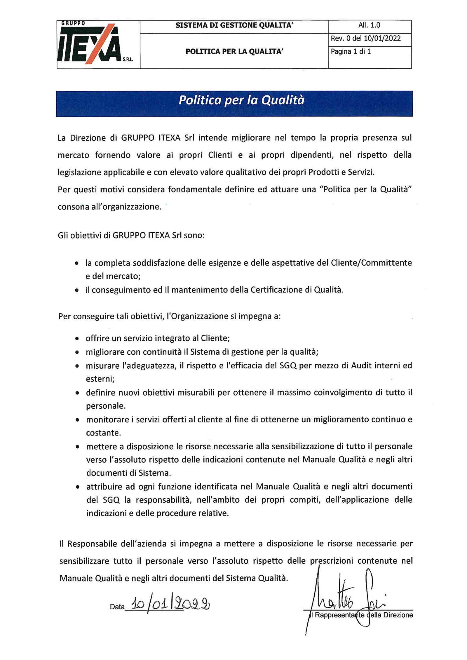 Assicurare la soddisfazione dei nostri clienti è da sempre la nostra principale mission aziendale, per questo motivo Gruppo Itexa ha deciso di adottare un Sistema di Gestione per la Qualità certificato ISO 9001, uno strumento che ci consente di garantire elevati standard qualitativi nei materiali e nei processi produttivi aziendali, oltre che stimolarci a seguire un cammino di miglioramento continuo in termini di lavoro, tempo e risorse impiegate, nonché della propria immagine aziendale a livello internazionale.